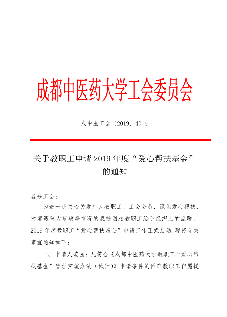 关于教职工申请2019年度“爱心帮扶基金”的通知