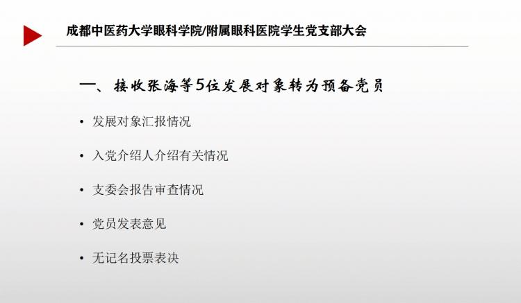会上,预备党员汇报预备期思想、工作情况;党小组组长汇报各转正同志预备期表现情况和小组意见;支部委员介绍各预备党员预备期教育考察情况;紧接着与会党员发表意见;最后进行无记名投票表决。