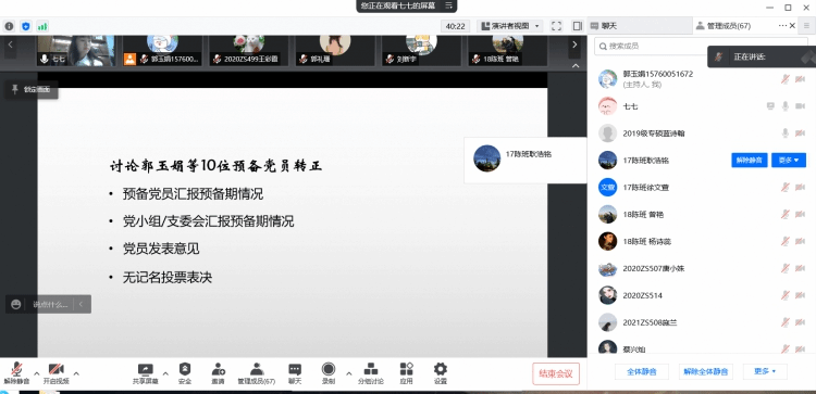 2022年5月26日晚上,学生支部召开线上党员大会,讨论预备党员转正和接收预备党员事宜,学生支部有表决权党员57人,应到57人,实到53人参加会议。学生党支部组织委员于嘉主持会议。