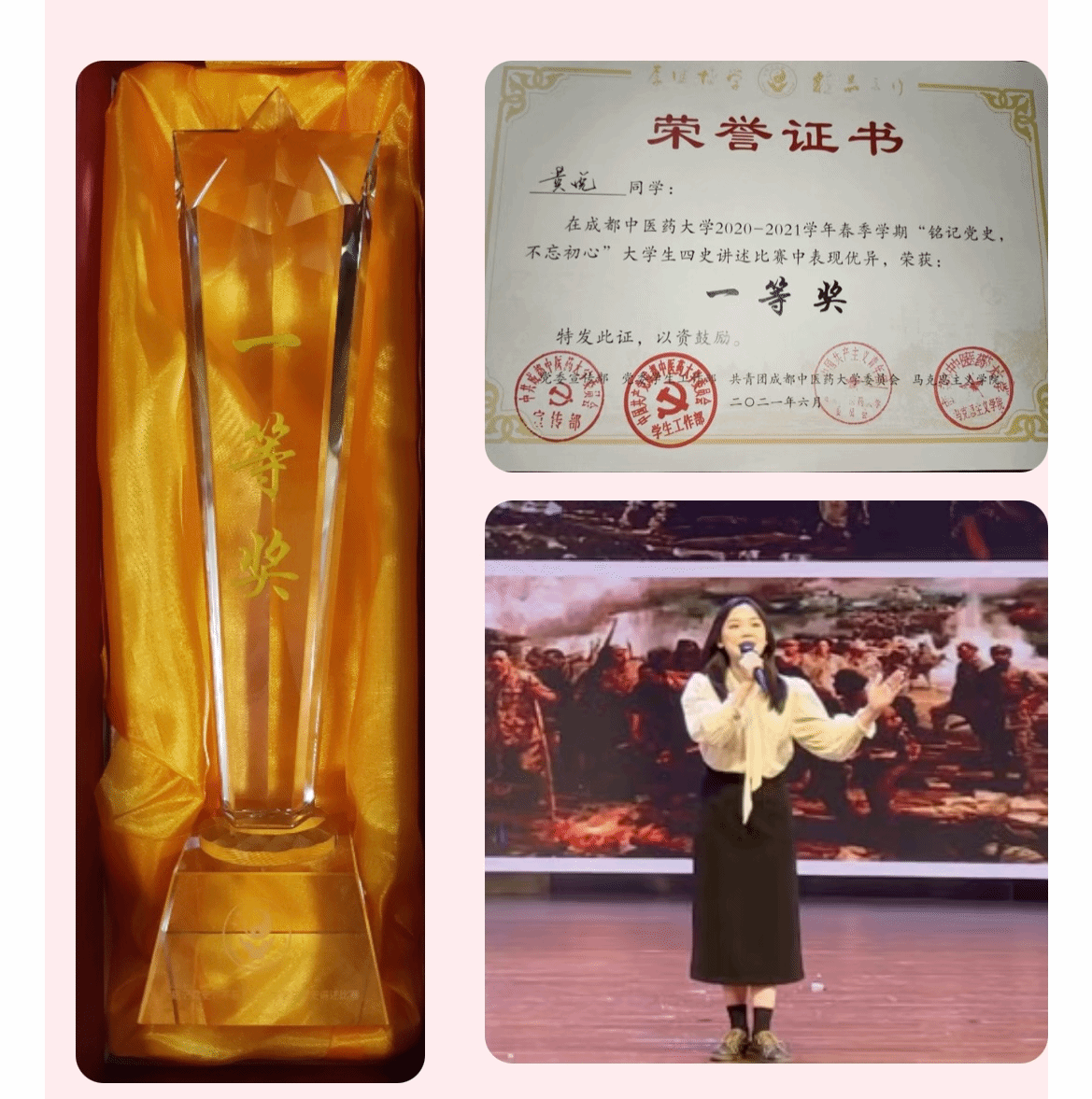 6月1日晚,Beat365中文官方网站"铭记党史·不忘初心"大学生四史讲述比赛决赛在百会堂演播大厅成功举行!我院眼视光学2019级黄悦同学在此次比赛中荣获一等奖!