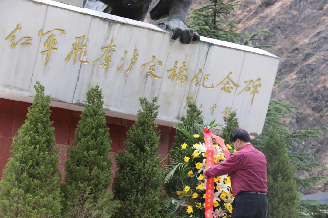 上午11点,在庄严肃穆的红军飞夺泸定桥纪念碑前,全体人员缓缓走过22名飞夺泸定桥勇士的花岗岩石柱。党员代表为烈士敬献花篮,段俊国书记上前整理绶带,党委副书记陶铮带领全体党员重温入党誓词,缅怀革命先烈。