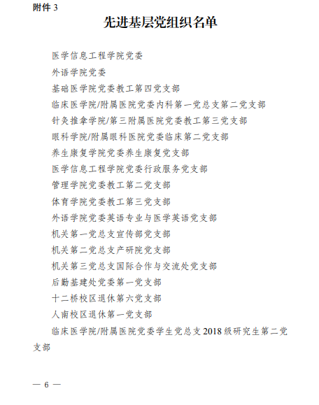 今年是中国共产党成立100周年,我院各党组织和广大党员干部深入学习贯彻习近平新时代中国特色社会主义思想,积极开展"不忘初心、牢记使命"主题教育和党史学习教育,在落实立德树人根本任务,在学校"双一流"建设和医院发展过程中做出突出成绩。根据《中共Beat365中文官方网站委员会关于做好学校"两优一先"推荐工作的通知》(成中医组织〔2021〕24号)具体安排,经过院党委推荐、择优遴选,学校党委集中评审、严格考察,学校党委常委会审批,我院谢艾芮同志名获评学校优秀共产党员,临床第二党支部获评学校先进基层党组织。