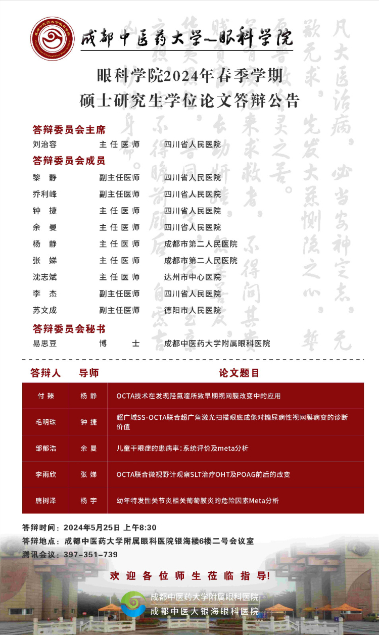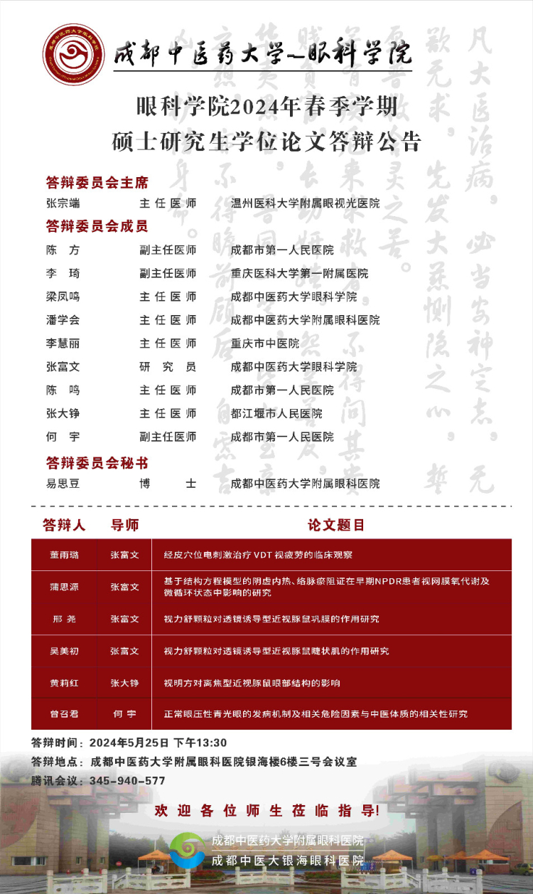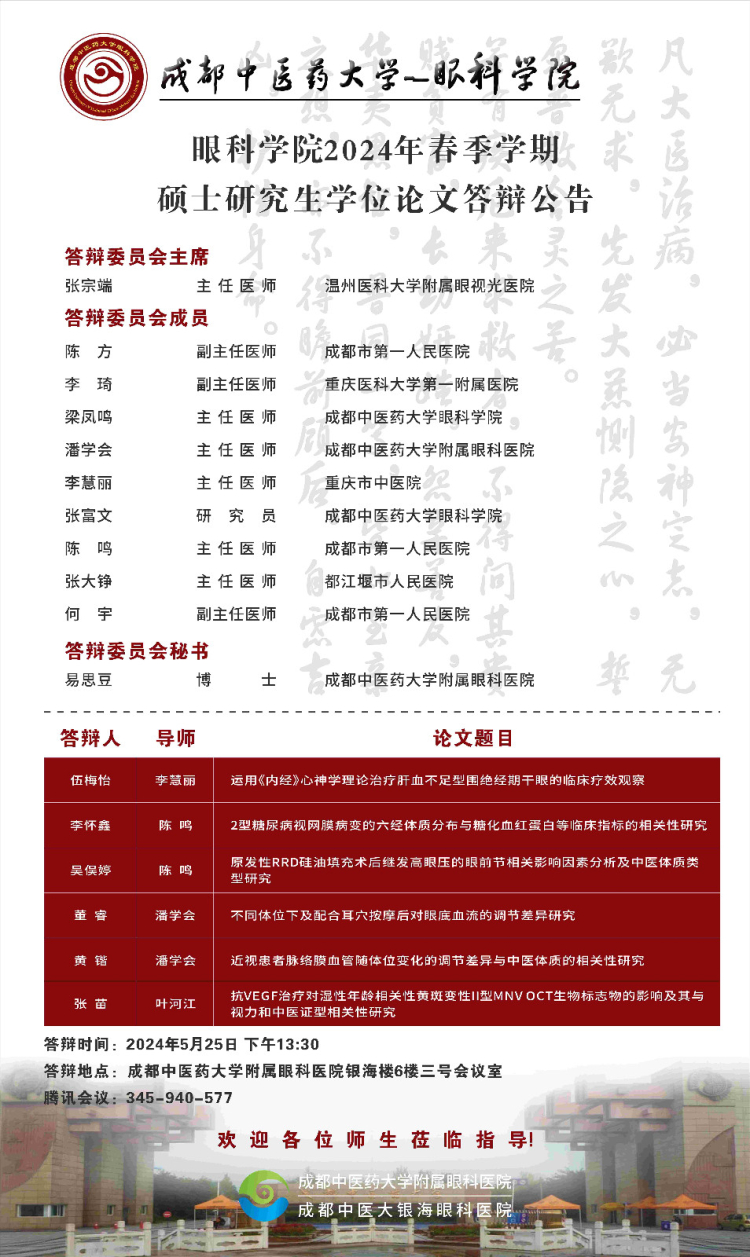 Beat365中文官方网站眼科学院2024届硕博士研究生学位论文答辩会将于2024年5月25日举行,具体答辩信息如下图所示: