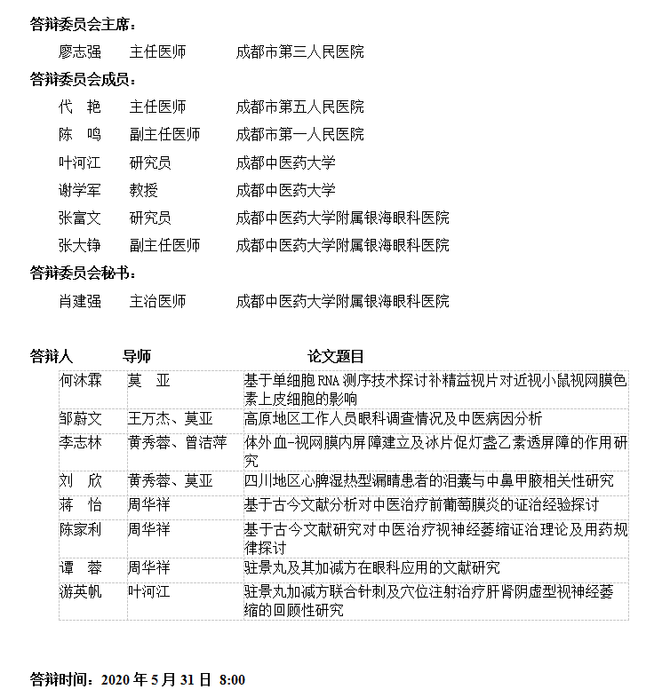 眼科学院2020年硕士研究生学位论文答辩公告(三)