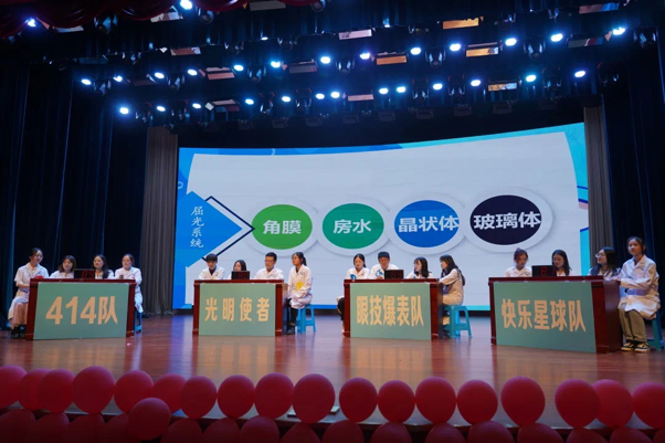 第二环节大开眼界,此环节为小队必答题。14道必答题,不光是对选手们所学专业知识熟悉度的考核还是对小队成员临场发挥能力极大的考验。第三环节别具慧眼,此环节为视频题。短暂视频题,根据提示记住关键点,进行论述作答。考验小队成员对眼健康知识的敏感度。第四环节触目惊心,此环节为风险题。按动抢答器抢答不同分值的题包,台上台下的同学都沉浸在一种紧张而激烈的抢答氛围中,各小队的成绩也因为各队不同的选择而不断上下波动。
