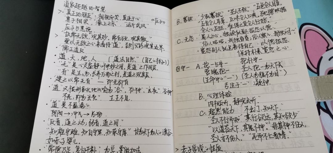 窗外的景色远不及拿在手中的笔、看在眼里的书,一抬头是暖阳春草,一低头却是散发魅力的文字。中国古代哲学值得我们探索与感受,李思同学的这份笔记叙述的是"道家超越的智慧",体现的是哲学经典的魅力。