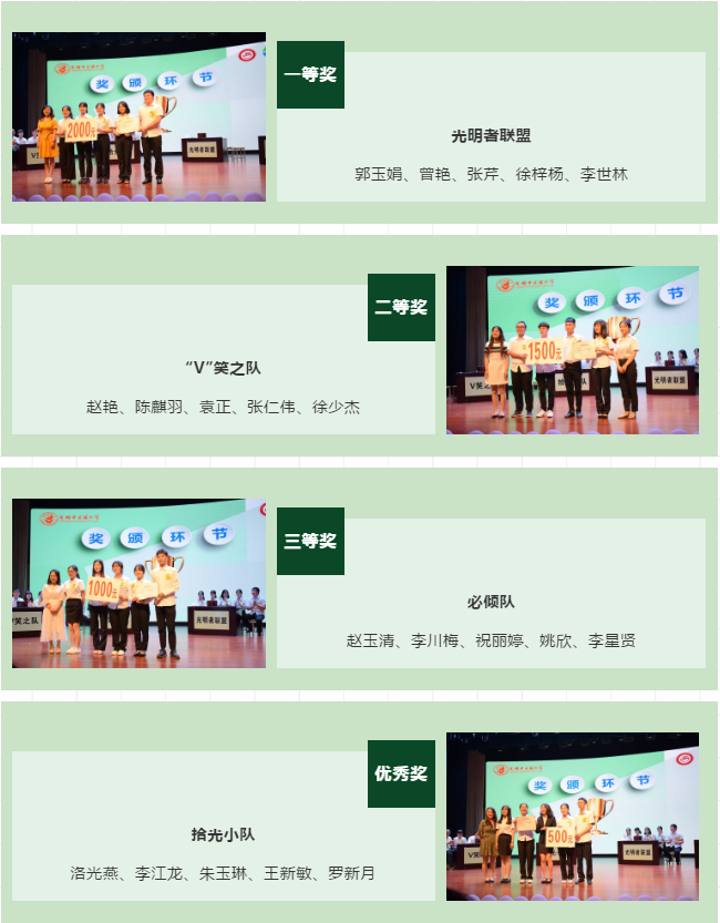 本次比赛一共决出团体一、二、三等奖及优秀奖各一名,个人最佳风采奖四名。
