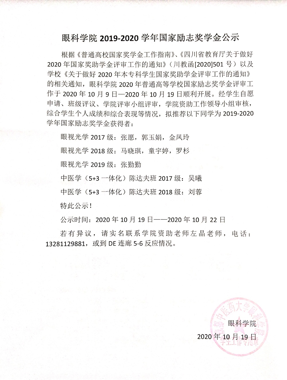 眼科学院2019-2020学年国家奖学金公示