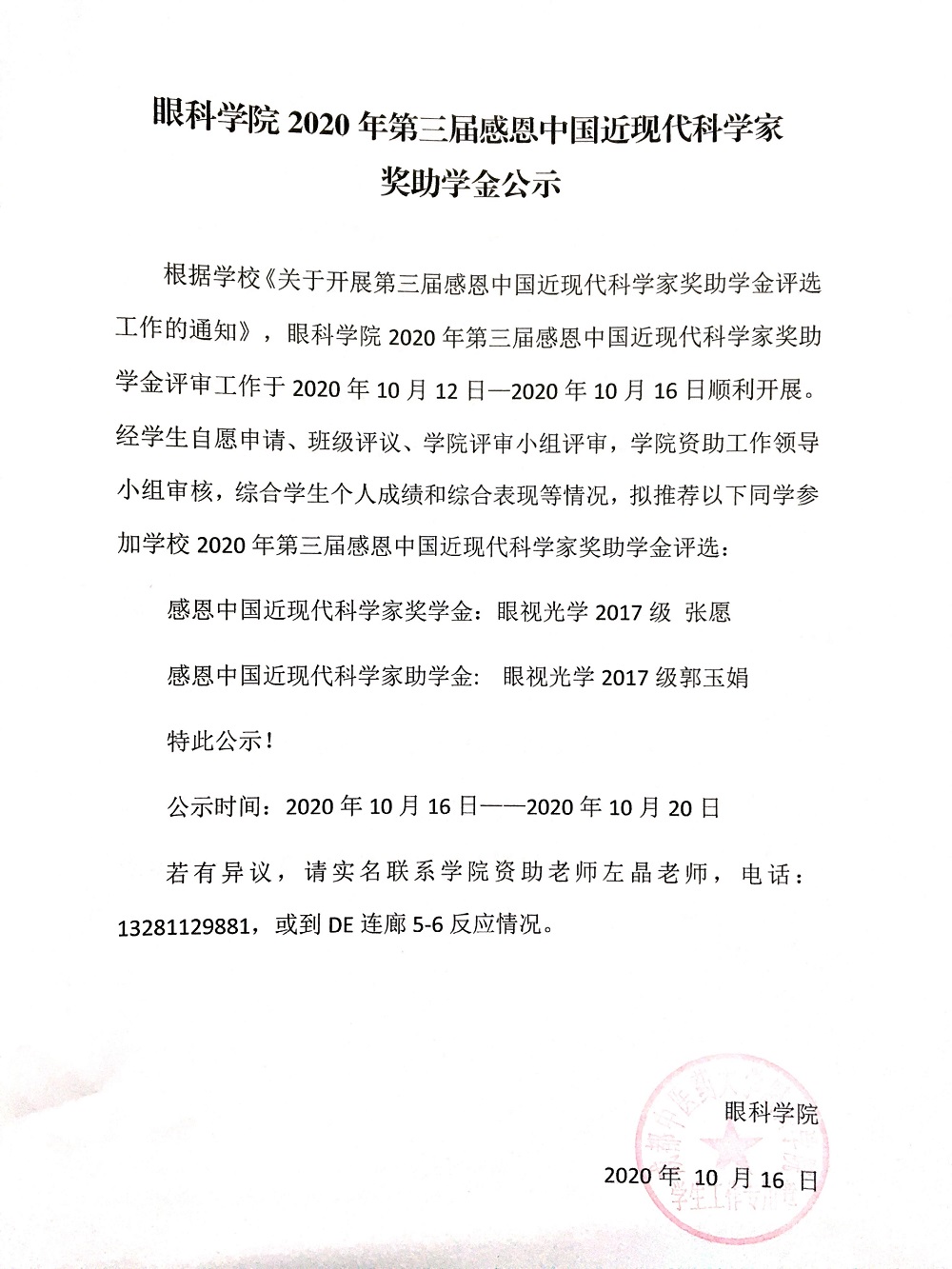 第三届感恩中国近现代科学家奖助学金眼科学院2020年评选公示