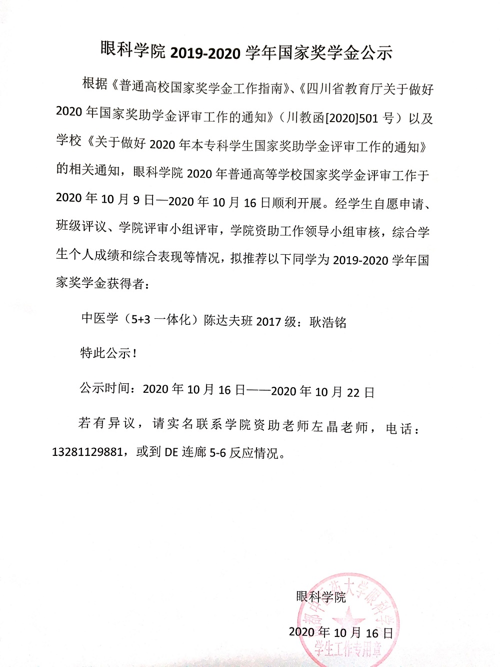 眼科学院2019-2020学年国家奖学金评选结果公示
