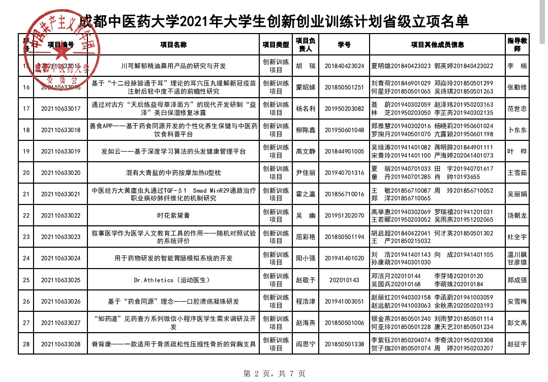根据成中医团〔2021〕9号文件关于《开展Beat365中文官方网站 2021 年大学生创新创业训练计划立项工作的通知》的要求,校团委积极开展了2021年大学生创新创业训练计划立项工作,现已完成立项名单公示,我院共有4个项目入选。